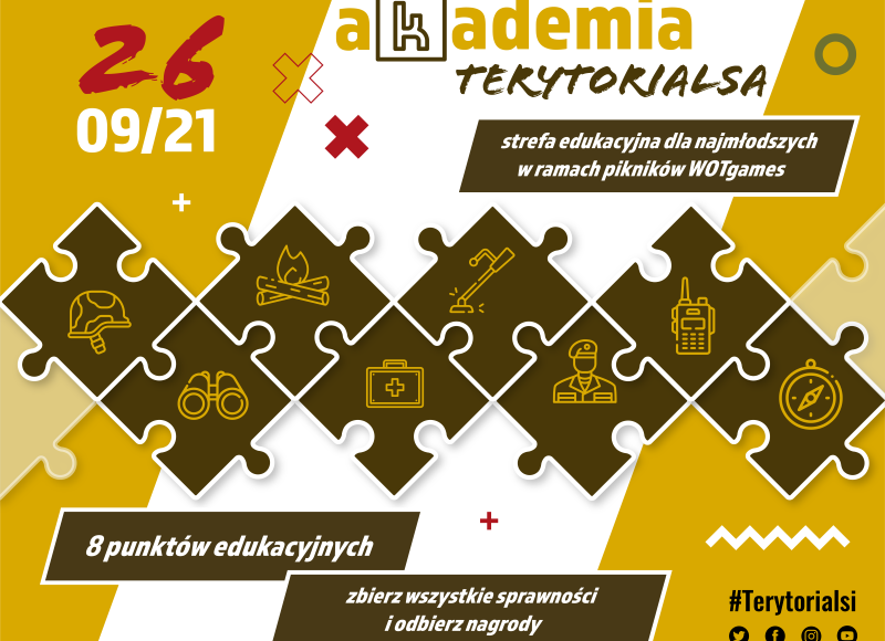Już dzisiaj ruszają zapisy do sportowej rywalizacji w kategoriach „rekrut” – do 18 lat oraz „Terytorials” – powyżej 18 lat. W każdej lokalizacji na uczestników czeka 200 darmowych pakietów startowych oraz medale dla najlepszych. Wejdź na stronę www.wotgames.wp.mil.pl i podejmij wyzwanie. Najmłodszych wraz z opiekunami zapraszamy do strefy „Akademia terytorialsa”, czekają tam na was ciekawe konkurencje i nagrody! Będzie to przestrzeń edukacyjno – zabawowa, gdzie dzieci poznają tajniki tematyki wojskowej i służby w WOT. Na ośmiu punktach edukacyjnych spotkają naszych żołnierzy – specjalistów z różnych wojskowych dziedzin. Dzieci poprzez zabawę będą zdobywały „sprawności”, a zdobycie ośmiu  będzie równoznaczne z otrzymaniem specjalnej nagrody oraz dyplomu. Aktywności na punktach będą maksymalnie angażowały uczestników. Wybrane zabawy „Akademii terytorialsa” to na przykład: „sokole oko”, „szkoła przetrwania” czy chociażby „poszukiwacz skarbów”. Szczegóły pod adresem www.wotgames.wp.mil.pl.